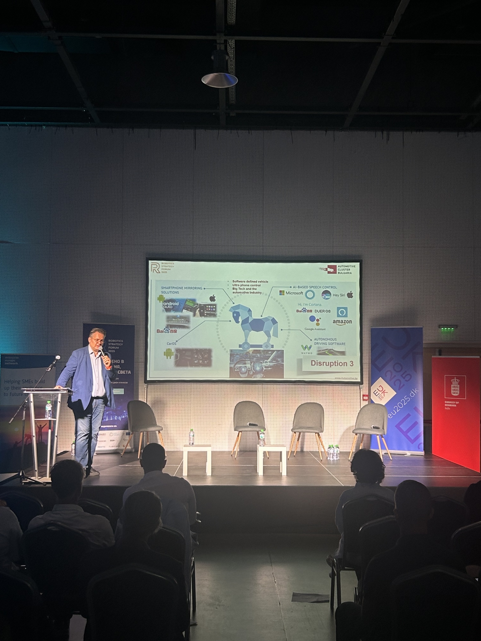 На 11 септември в Иновационен форум „Джон Атанасов“ Арх. Любомир Станиславов беше сред лекторите на Robotics Strategy Forum 2025, организиран от PARAi – Professional Association of Robotics, Automation and Innovations. Той представи ролята на роботиката за развитието на автомобилната индустрия и сподели как Аутомотив Клъстър България и EDIH-NWACB – Европейски дигитален иновационен хъб Северозапад подпомагат компаниите в процеса на трансформация към Индустрия 4.0.