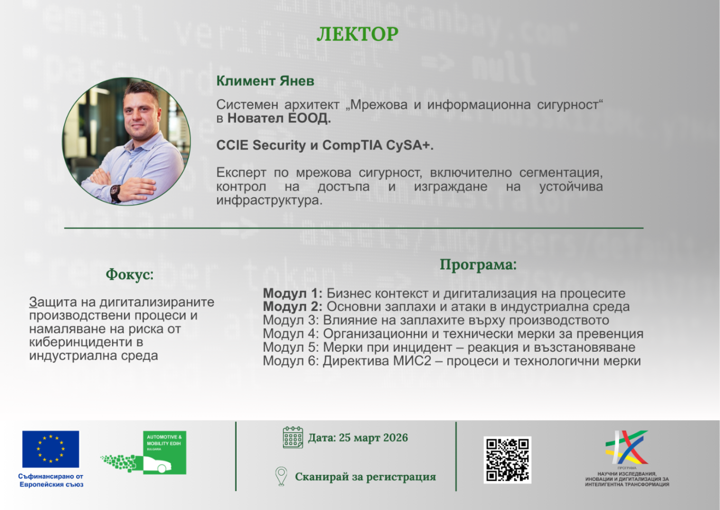 В допълнение, обучението предоставя практически насоки за прилагане на изискванията на Директива МИС2 (NIS2), като се разглеждат необходимите организационни процеси, технически мерки и отговорности на организациите с цел постигане на съответствие и повишаване на цялостната киберустойчивост. Чрез комбинация от презентации, дискусии и практически примери участниците изграждат реални умения за оценка на риска, вземане на информирани решения и ефективна защита на дигитализирани производствени среди.